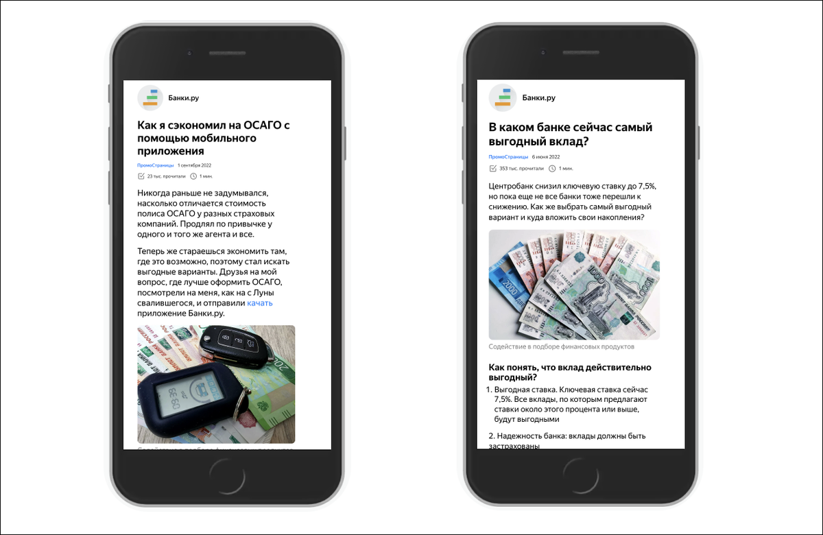 Для продвижения приложения Банки.ру использовали разный формат подачи материалов и несколько продуктов. Одни из самых удачных публикаций — личная история о том, как воспользоваться приложением, чтобы оформить ОСАГО, и образовательная статья о выборе вклада.